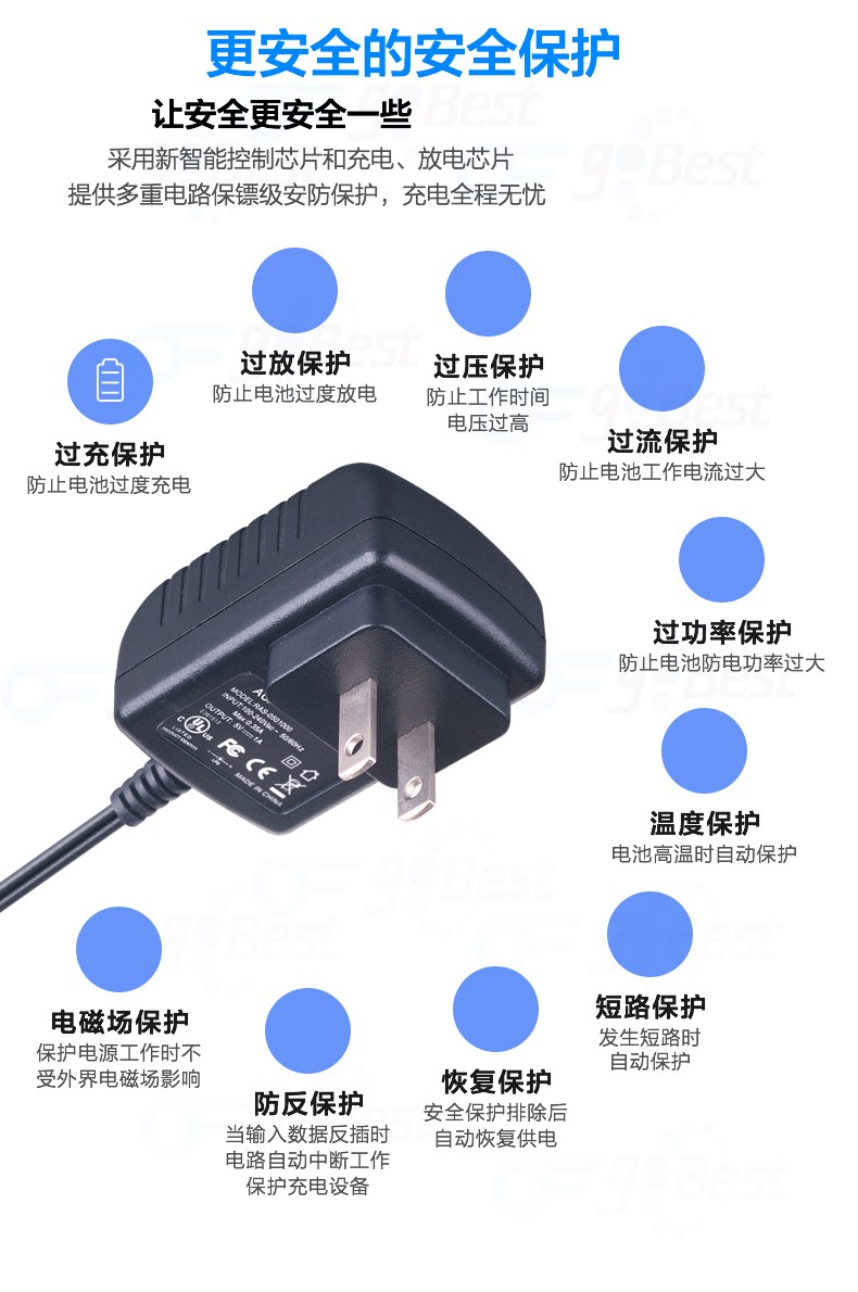 • 采用前沿IC控制方案和先進的制造工藝,高精度,低噪音;過壓,過流,過充,短路等多重保護。
