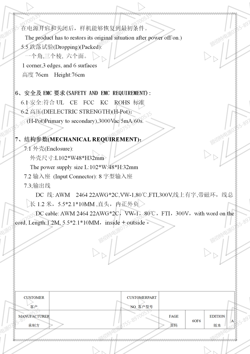 19V3.5A電源適配器規(guī)格書