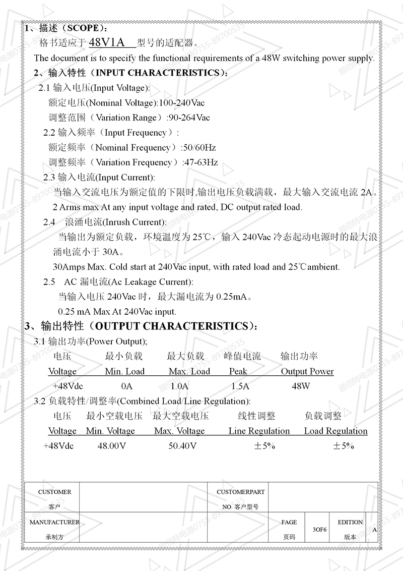 48V1A電源適配器規格書