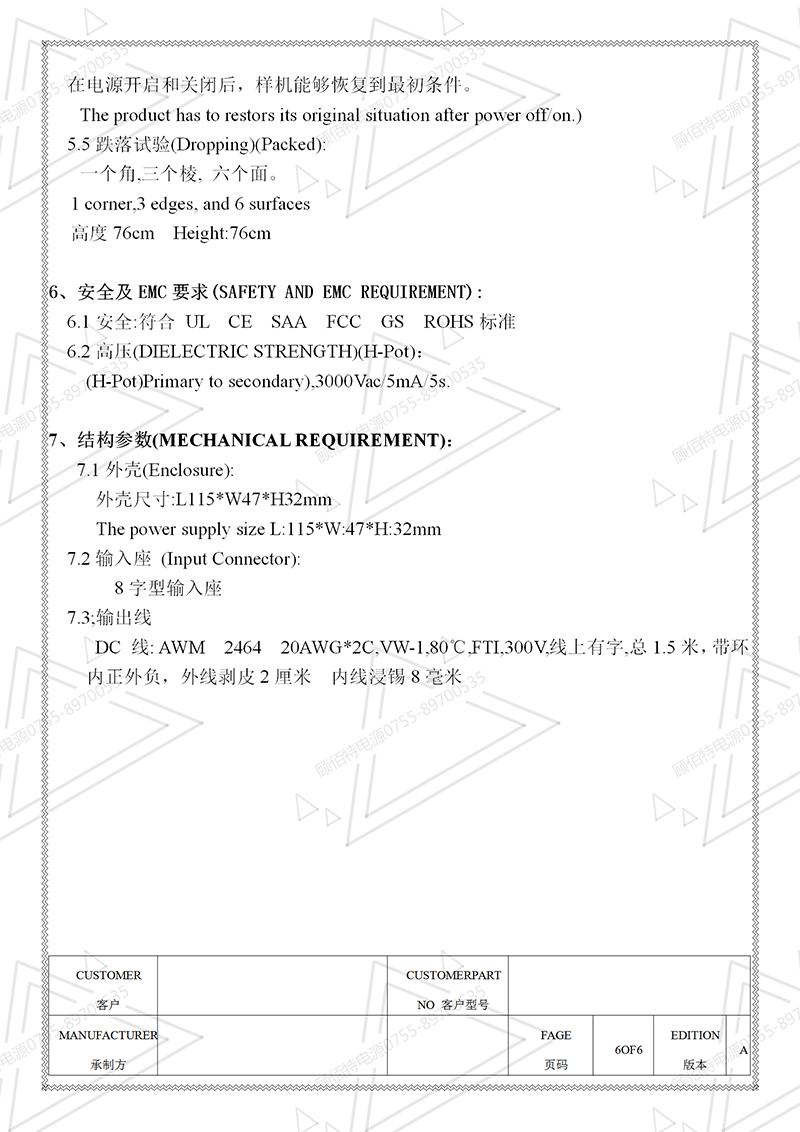 19V3.5A電源適配器規格書